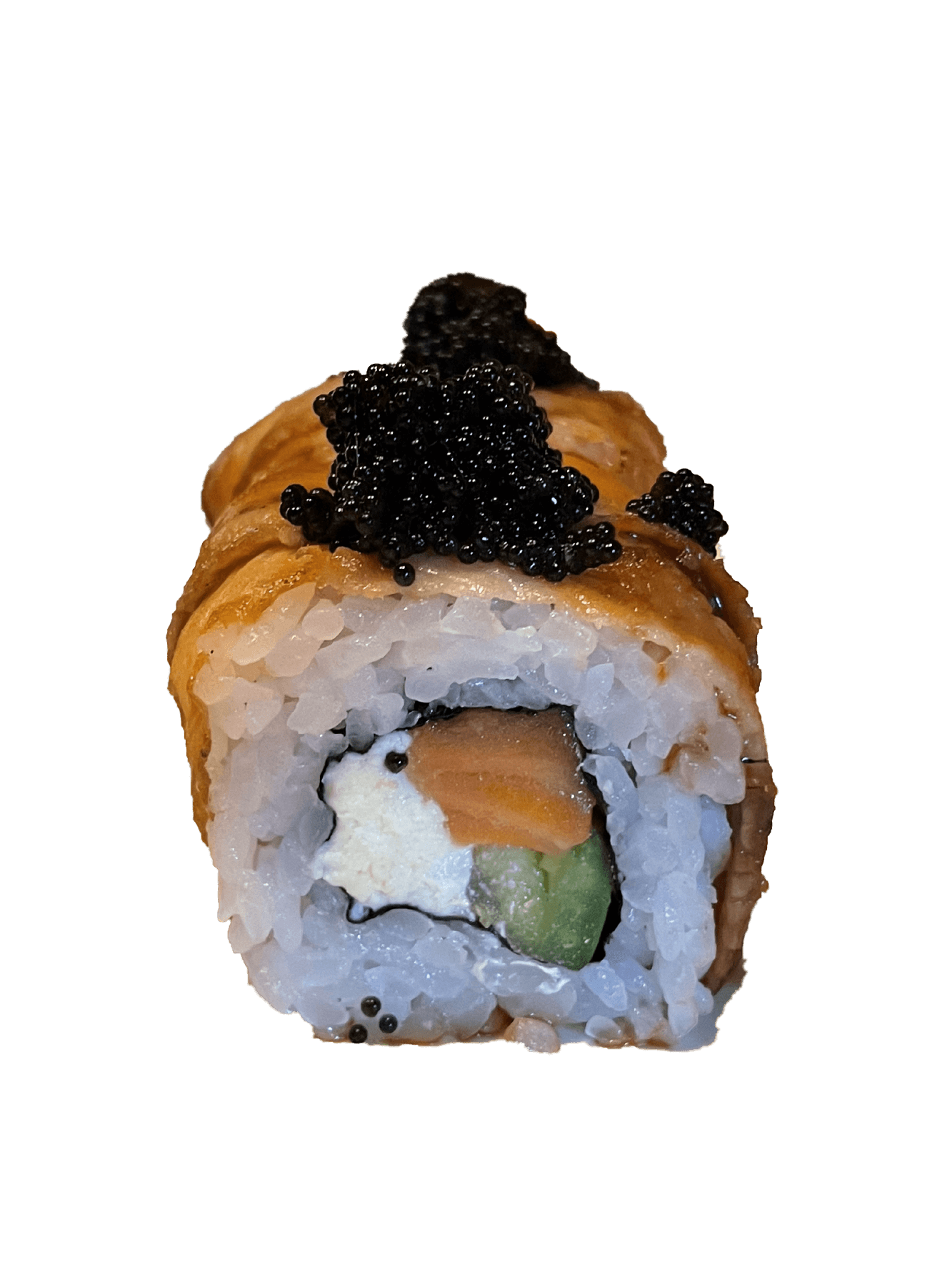 Roasted eel, salmon, avocado, cream cheese, black tobiko, unagi sauce.