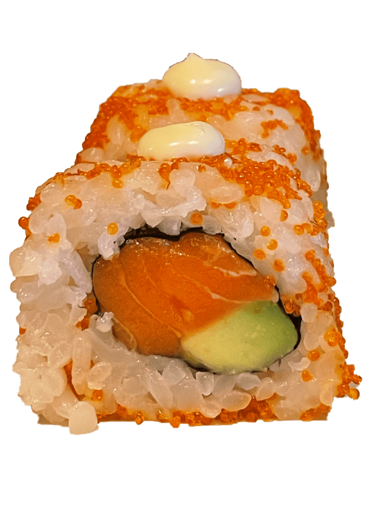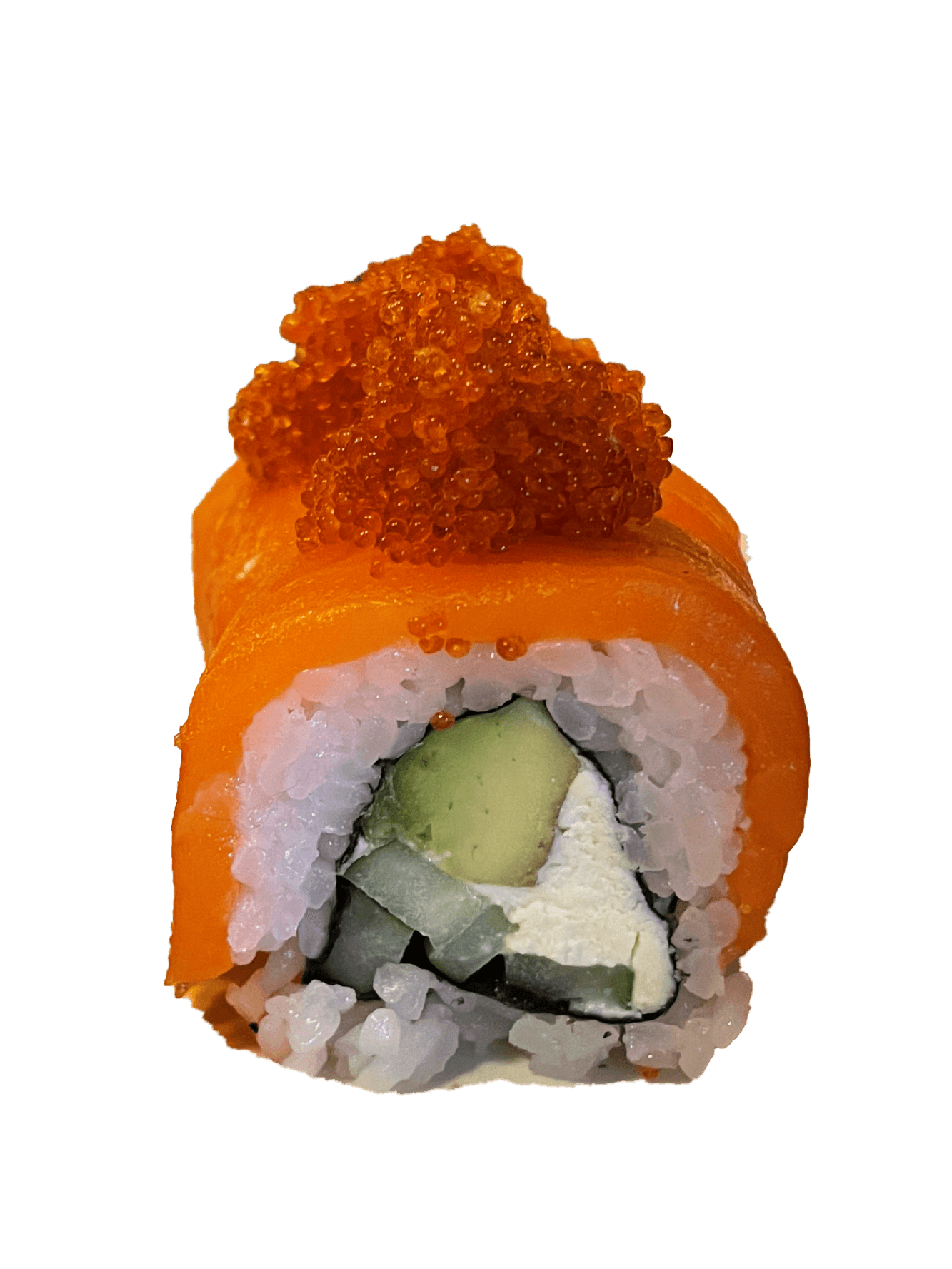 Salmon, cream cheese, avocado, cucumber, red tobiko.
